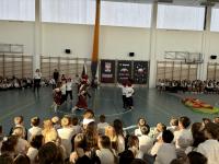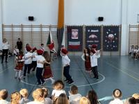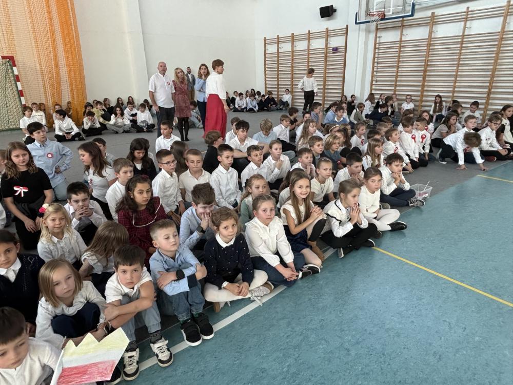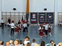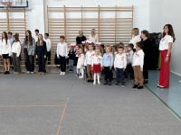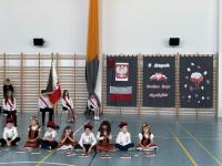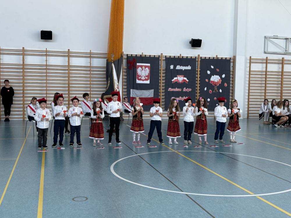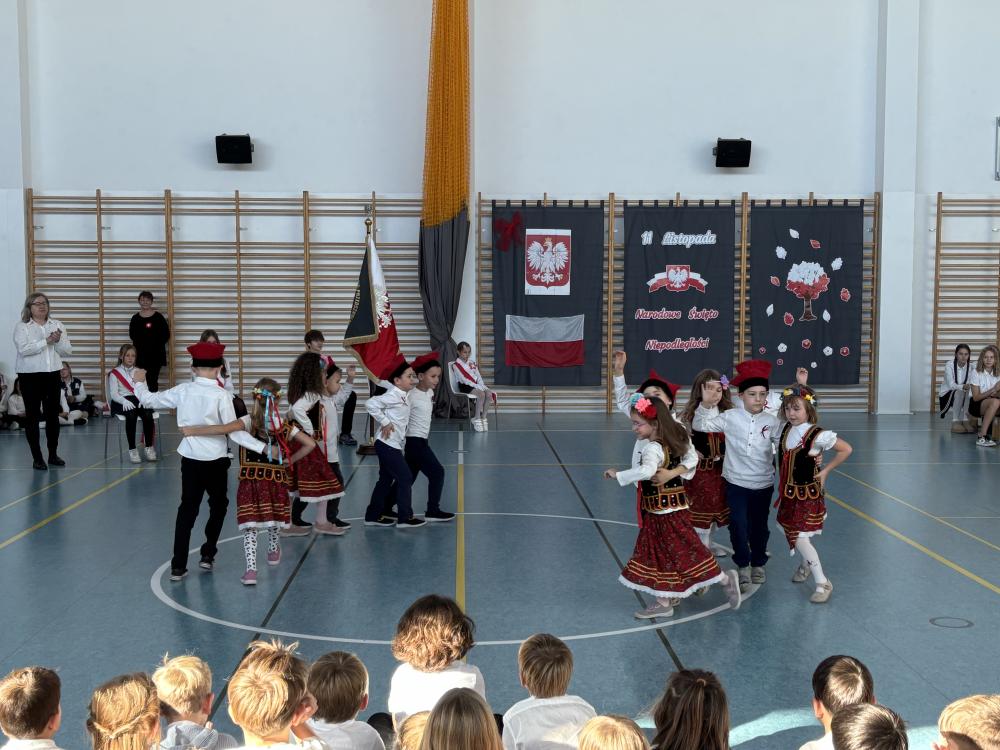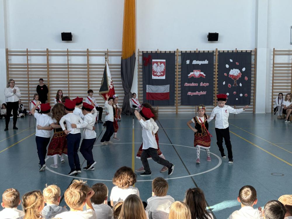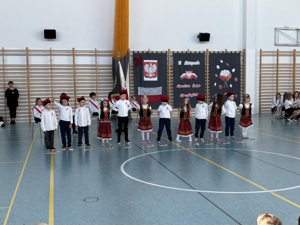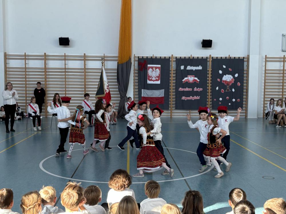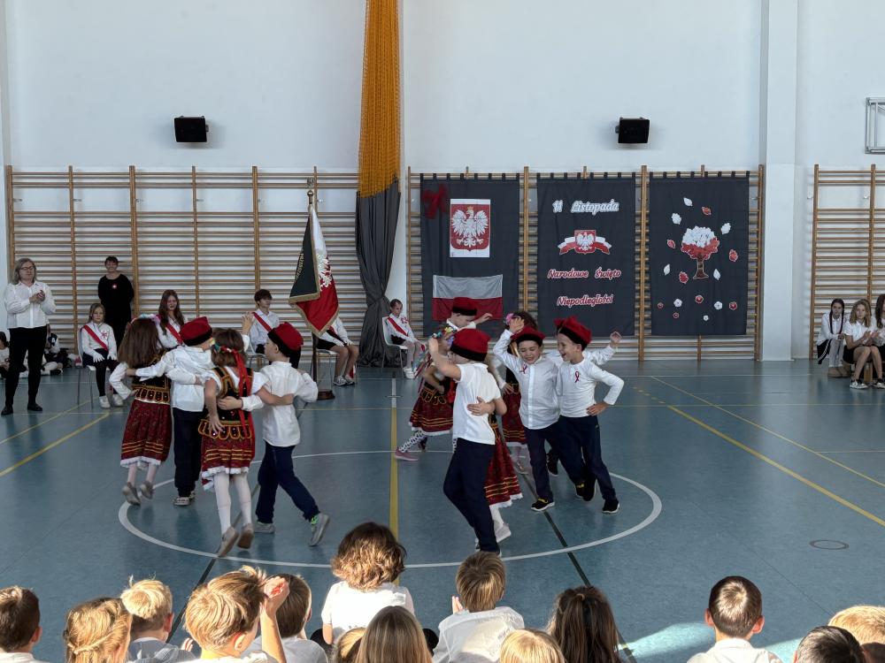 Uczniowie klas 6b i 6c przygotowali piękną część artystyczną, w której przypomnieli drogę naszego kraju do wolności, a także znaczenie takich wartości jak patriotyzm, odwaga i miłość do Ojczyzny. Występ uświetniły również najmłodsze dzieci z klasy 0b, które z dumą zaprezentowały piosenkę i taniec ludowy „Krakowiak”.